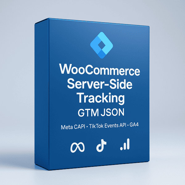 WooCommerce-এর জন্য GTM JSON—Meta CAPI, TikTok Events API, GA4 সার্ভার-সাইড ট্র্যাকিং এক্সপোর্ট ও ডিডুপসহ। দ্রুত ইনস্টল, কম ডাটা লস, ROAS বৃদ্ধি করুন।